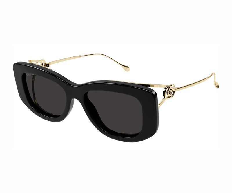 Add a touch of timeless elegance to your look with the GUCCI 1566SA 001 sunglasses. Designed in a chic cat-eye silhouette, these sunglasses feature a bold black frame that exudes sophistication and feminine charm. The grey solid lenses provide essential UV protection while enhancing your style with a modern edge. Crafted from a premium combination of materials, this pair offers both durability and lightweight comfort for all-day wear. Whether you're heading to brunch or strolling through the city, these GUCCI sunglasses make a luxurious statement. Perfect for fashion-forward individuals who appreciate classic glamour with a contemporary twist, the 1566SA 001 is a must-have accessory for any wardrobe.