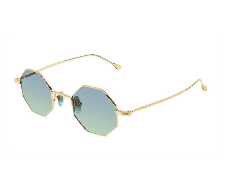 Make a bold fashion statement with GUCCI 1814S 004 sunglasses. Designed in a striking hexagonal shape, these sunglasses feature a sleek gold metal frame that adds a touch of modern sophistication. The light blue solid lenses offer a trendy and refreshing aesthetic, perfect for standing out in any crowd. Crafted from high-quality metal, this lightweight yet durable frame ensures both comfort and style. Ideal for fashion-forward individuals, these sunglasses provide essential UV protection while elevating your look with GUCCI’s iconic luxury. Whether you’re heading to a sunny getaway or a city stroll, this unique pair blends creativity and elegance effortlessly.