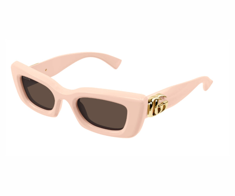 The GUCCI 1827S 005 sunglasses offer timeless elegance with a modern twist. Featuring a soft pink acetate frame in a classic cat eye shape, these sunglasses are both stylish and versatile. The solid brown lenses provide essential UV protection, combining fashion with function. Crafted from premium acetate, the frame ensures durability and comfort for everyday wear. A standout gold double-G logo on the temples adds a signature Gucci touch, elevating the design with a hint of luxury. Perfect for adding a chic statement to any outfit, the GUCCI 1827S 005 is ideal for those who appreciate classic style with a contemporary edge.