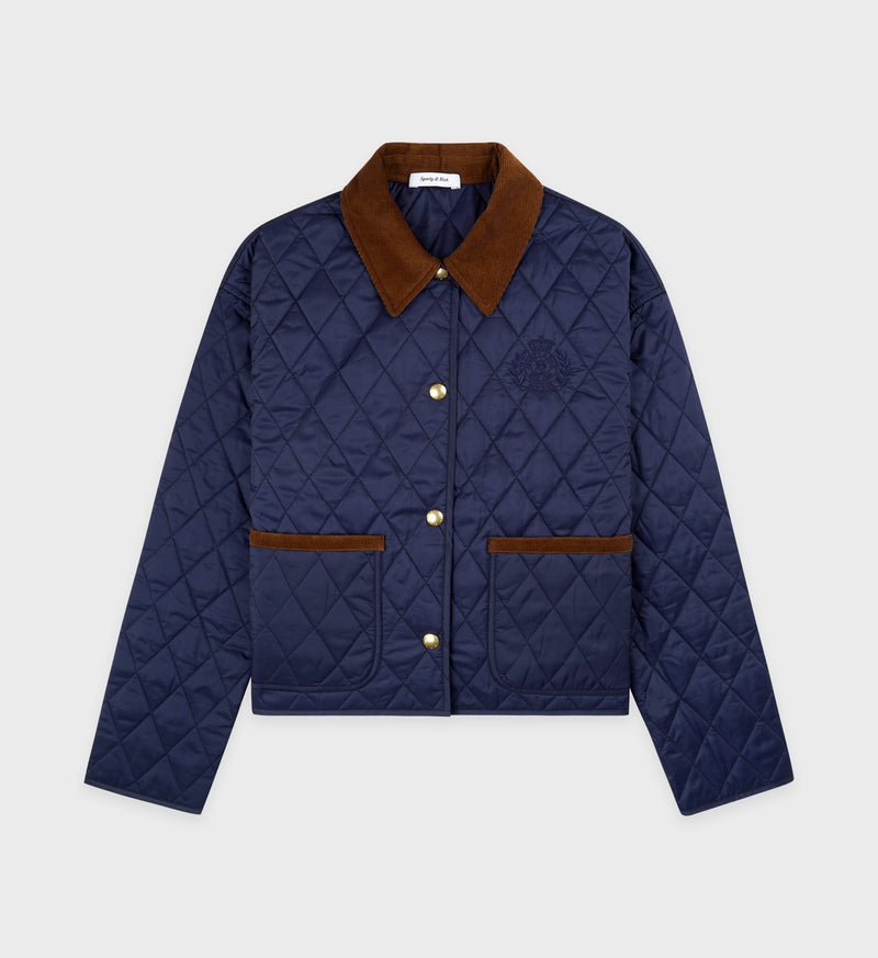 Inspired by the classic hunting jackets, ours is a cropped quilted nylon piece with snap button closure, contrasting corduroy collar and functional pockets at the front and inside.