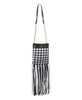 Elevate your style with the Versace Houndstooth Shoulder Bag, a chic accessory featuring a distinctive rectangular shape and elegant fringe detailing. Key attributes: White | Black | Leather | Cotton | Small internal pocket | Rectangular elongated shape | Black leather shoulder strap with gold chain | White and black fabric fringes | High leather edge with applied gold studs | Composition & care: Leather | Cotton