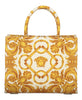 Elevate your style with this luxurious tote bag from Versace, crafted from jacquard motif canvas with leather inserts and gold-tone metal hardware. Perfect for any occasion, it combines elegance with functionality. Key attributes: Ivory | Multicolor | Canvas | Removable strap | Internal zippered pocket | Rigid handles | Gold-tone metal hardware | Dimensions & fit: W28 x H21 x D14 cm | Strap length: 110 cm | Composition & care: 100% Polyester | 100% Leather | 100% Cotton
