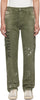 Stretch denim jeans. Fading, distressing, whiskering, and paint splatter throughout.
