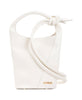 Elevate your style with the Jacquemus Le Petit Tourni Bag, a luxurious shoulder bag crafted from cow leather and cotton. This unique bucket design features a round top handle and a knotted shoulder strap for added elegance. Key attributes: Light Ivory | White | Cow Leather | Cotton | Snap button closure | Interior zipper pocket | Bucket design | Round top handle | Knotted shoulder strap | Gold metal logo and hardware | Dimensions & fit: W: 22cm H: 25cm D: 22cm | Composition & care: Cow Leather | Cotton