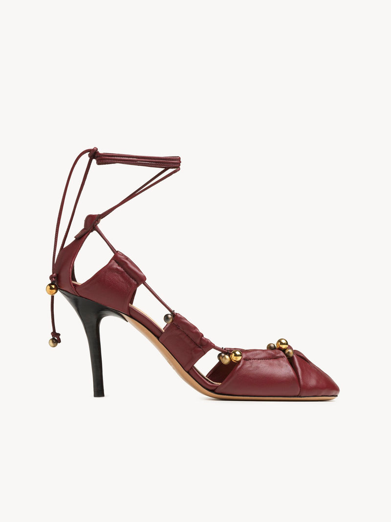 Crafted from shiny sheepskin, the Luna pumps are inspired by a Chloé archive. The pleated cutout silhouette creates a deconstructed effect, elevated with antique gold bells. Knotted straps wrap around the ankles while the Chloe logo finishes the back of the shoe.