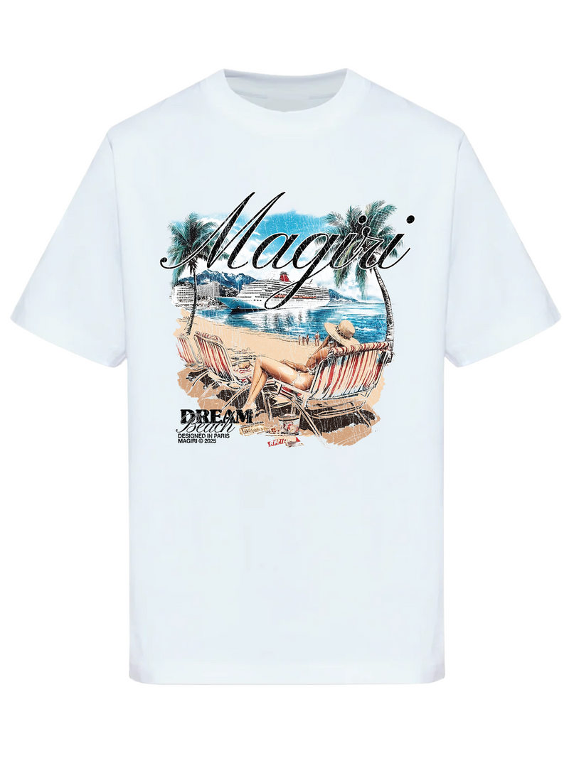 The MAGIRI Dream Beach T-Shirt captures the spirit of escapism through its nostalgic Riviera-inspired artwork. Made from luxurious heavyweight cotton, it offers a relaxed silhouette and soft touch for everyday sophistication. The cinematic print evokes the golden age of travel - a statement piece for modern resort dressing.
