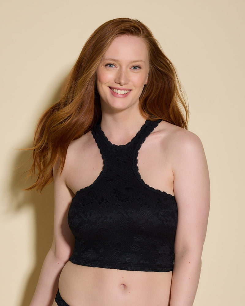• Specifically sized for small frames paired with full cups (Curvy), this halter neck cropped lace camisole can be worn by itself, or as an underpinning.