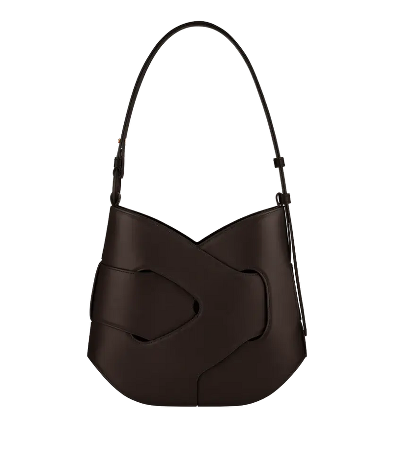 The “Nodde Hobo,” whose name echoes the French word for “knot,” is made up of two perfectly symmetrical, intertwined leather modules. Its beveled design accentuates its dynamic design and its base, set into the main body of the bag using a distinctive assembly technique.