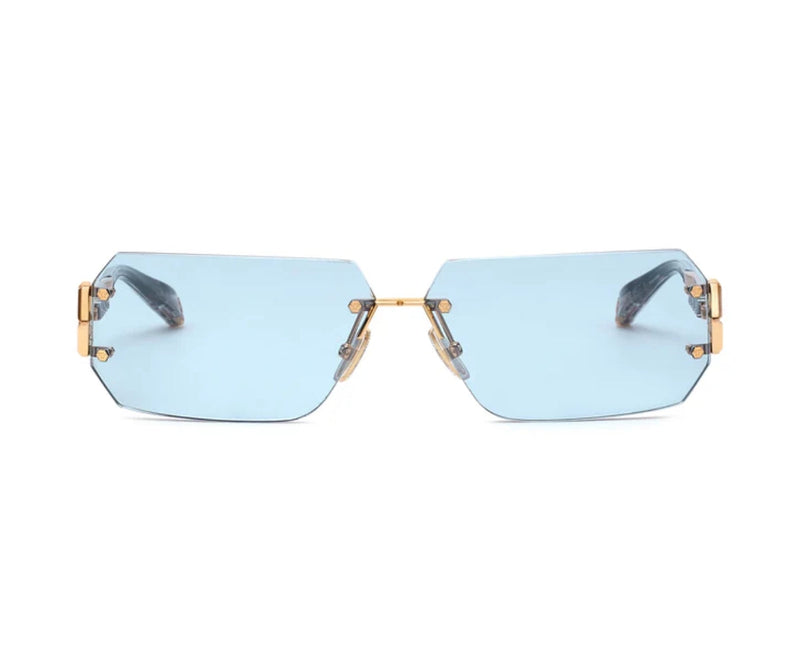 PHILIPP PLEIN model SPP110 340F sunglasses make a striking statement with their bold and exclusive design. The irregular-shaped frame, crafted from high-quality metal, features a luxurious gold finish that exudes sophistication and modern elegance. Paired with solid blue lenses, these sunglasses provide only UV protection, ensuring both style and eye safety. Designed for individuals who dare to stand out, the SPP110 340F reflects PHILIPP PLEIN’s signature fusion of luxury and contemporary edge. The unique shape and polished detailing make these sunglasses a standout accessory, perfect for elevating any outfit. Ideal for fashion-forward and confident personalities, they combine exclusivity, innovation, and timeless appeal in one striking eyewear piece.
