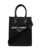 Black shoulder bag from Dolce Gabbana. Made of fabric with calf leather trims, this model features a snap closure, white logo appliqué, two half-round handles, detachable, adjustable shoulder strap, silver-tone metal hardware and one internal compartment with two slip pockets.