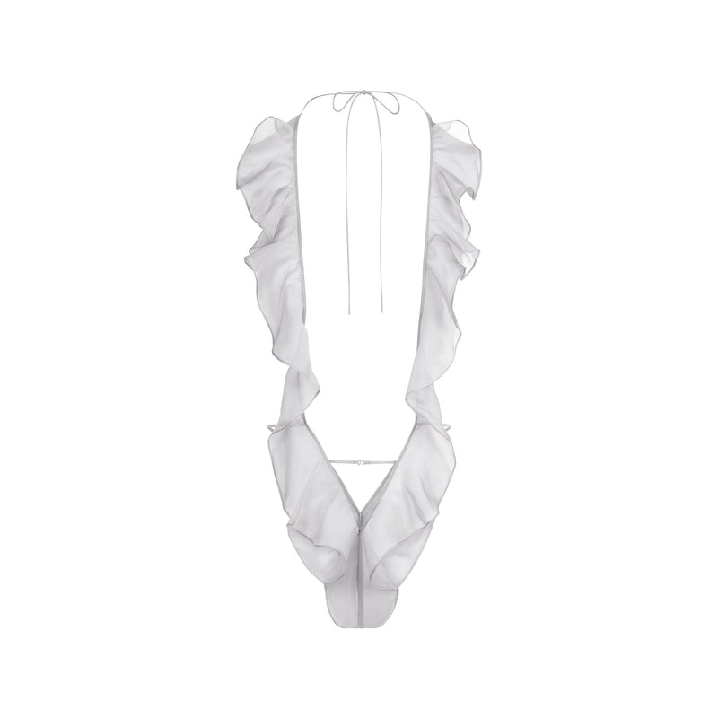Unforgettable allure. Sheer and delicate in 100% silk chiffon, this deep plunge teddy features feminine frill details and an open silhouette at the sides and back. Complete with elastic at the waist, dainty ties at the neck, and thong back coverage. Fits true to size.