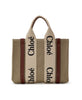 Chloé Small Woody Tote Bag in Linen. Natural color linen with brown leather accents and two beige cotton ribbon handles. Single compartment, open top with inner pocket, contrasting logo printed on the two handles. Adjustable and removable brown leather shoulder strap. Sold with authenticity tag and dustbag. Composition: Linen, Leather, Cotton. SKU Brand: CHC23AS397L17847 Internal SKU: 25AGO21