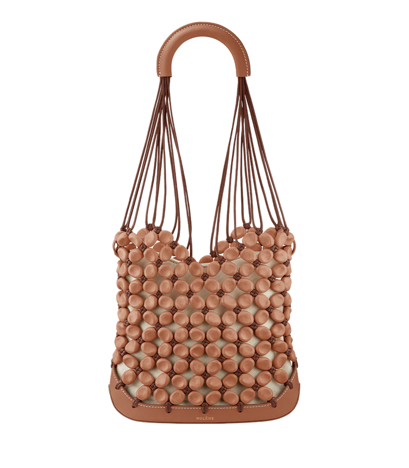From the Plèi collection, which puts leather off-cuts front and center, the “Solé” model blends innovation and artisanship. Made in France, the 240 pebble-like pearls are created using leather off-cuts from Polène collections. They are then threaded onto waxed cotton cording and held in place by 120 handmade knots using the traditional technique of macramé. Leather detailing embellishes this net-inspired bag with its stitched smooth leather base and handle.