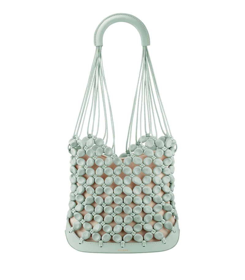From the Plèi collection, which puts leather off-cuts front and center, the “Solé” model blends innovation and artisanship. Made in France, the 240 pebble-like pearls are created using leather off-cuts from Polène collections. They are then threaded onto waxed cotton cording and held in place by 120 handmade knots using the traditional technique of macramé. Leather detailing embellishes this net-inspired bag with its stitched smooth leather base and handle.
