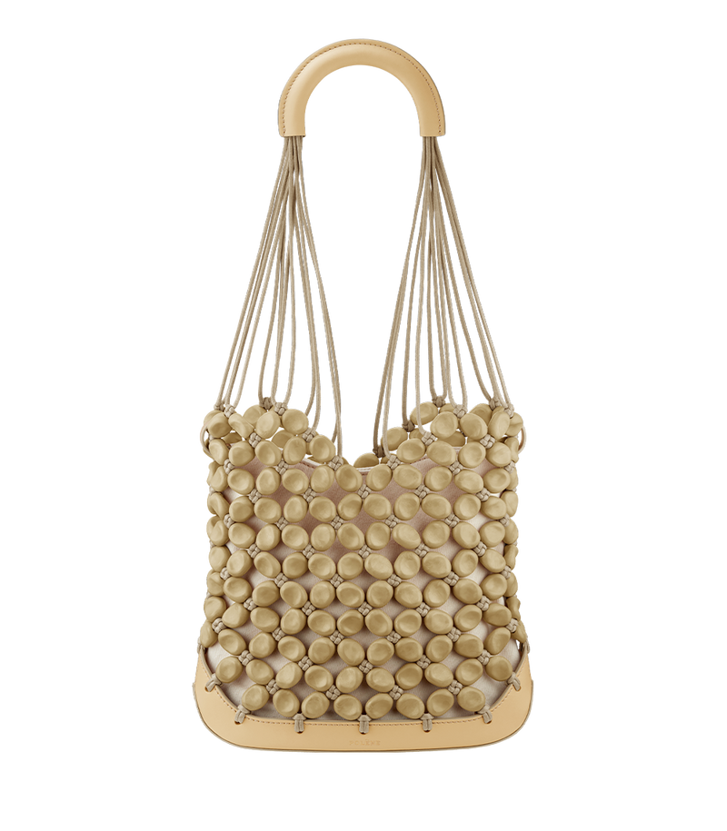 From the Plèi collection, which brings upcycled leather offcuts into play, the “Solé” bag blends innovation and artisanship. Made in France, the 240 pebble-like pearls are created using leather offcuts from other Polène collections. After being threaded onto waxed cotton, they are held in place by 120 hand-tied knots following a traditional macramé technique. This net-style bag is embellished with leather detailing for its stitched smooth leather base and handle. The name “Solé” is a play on the French word for “sun”, showcasing the summery vibe of this bag.