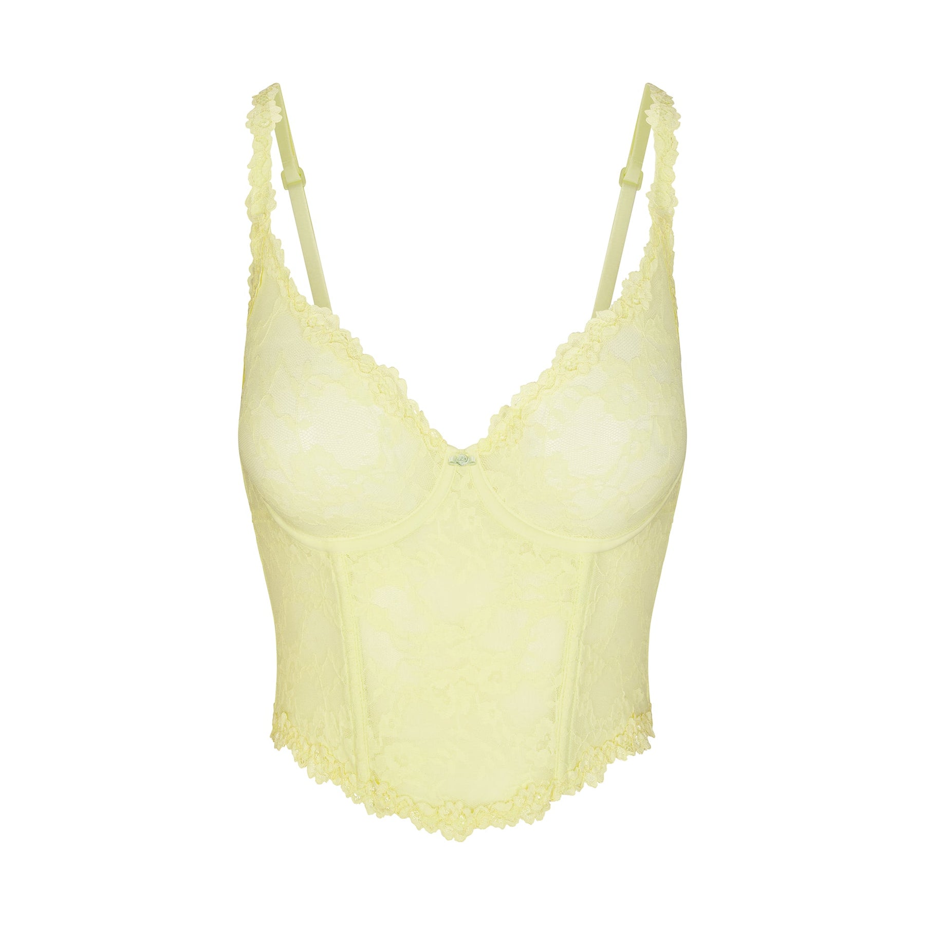 A lacy look to lust for. This skimpy intimate is made with our delicate stretch lace that hugs your curves for a figure-flattering fit. Detailed with a dainty contrast rosette, lace trim throughout, and unpadded cups. The underwire and see-through mesh lining at the bust, sides, and back offer support, while the perfectly-placed boning maintains structure. Features adjustable straps and a hook and eye closure in the back. Fits true to size.