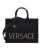 Elevate your style with this women's shoulder bag by Versace. Crafted from fabric with luxurious leather details, this tote bag features a spacious interior, envelope pocket with zip closure, and gold-colored rhinestone brand writing. Made in Italy, it includes a removable leather detail with a three-dimensional brand logo and a unique Greek motif shoulder strap. Dimensions: Width 38cm, Height 29.5cm, Depth 12.5cm.