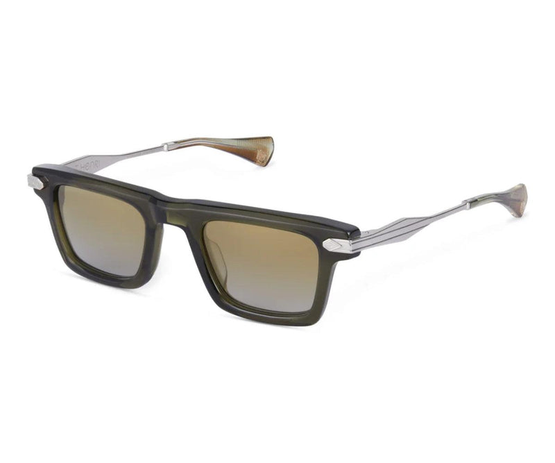 Handmade in One Collectible Batch Production.Combination Titanium and zyl acetate construction, utilizing a cotton extrusion method with custom complex coloration and tapered construction featuring 8mm hand-carved fronts connected by solid titanium monoblock connections and mixed temple construction.Iconic and bespoke front connections with décor finished in 18K Gold.Features a custom jeweled Sterling silver beauty mark embedded in a crystallized temple tip. Constructivist details include a barreled mega post and screw-through system connecting the different materials. Zyl hypoallergenic temple tips.Ergonomically designed to fit most face shapes.