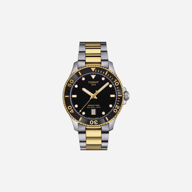 The Tissot Seastar 1000 Quartz features a black dial, two-tone stainless steel case and bracelet with yellow gold PVD coating, and Swiss quartz movement. With a 40mm case size and 300m water resistance, it's a stylish and reliable choice for diving enthusiasts.