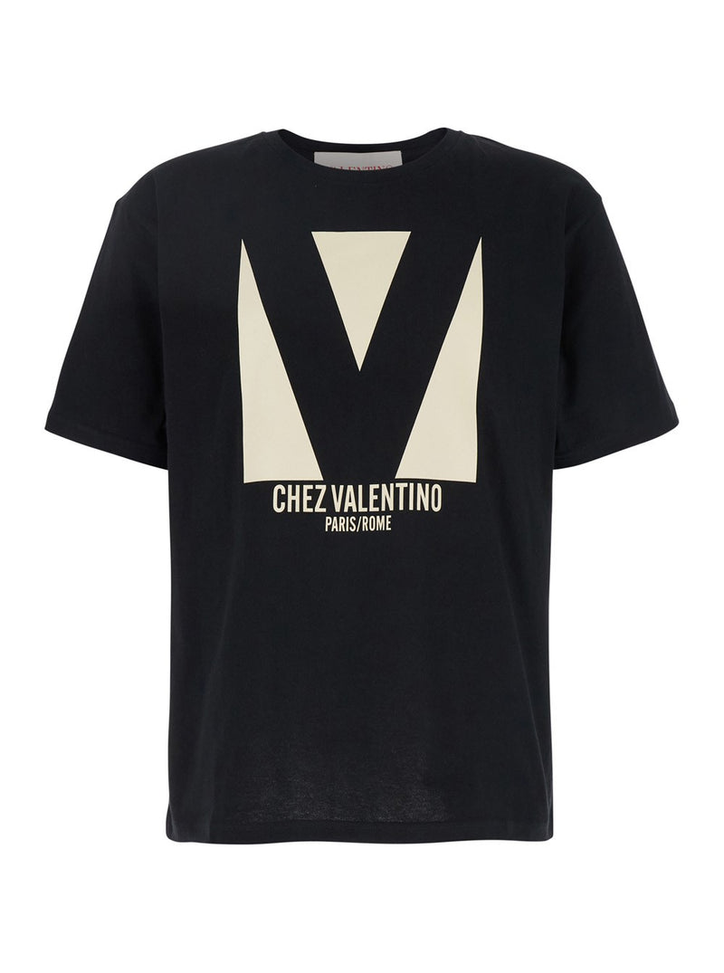 Valentino 'Chez' Black Crewneck T-Shirt with Maxi Logo Print on the Front in Cotton Man