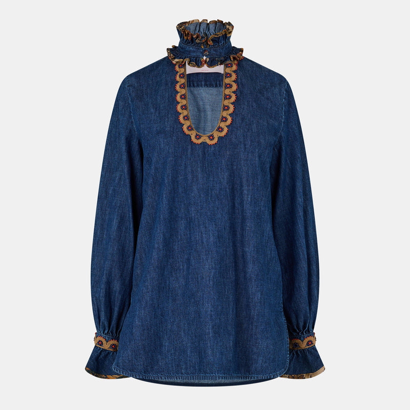 Refresh your collection with Valentino's Embroidered Chambray Denim Top. Breathable and lightweight, this women's shirt features a plunging neckline for a daring touch. Perfect for an off-duty ensemble, whether meeting friends for brunch or visiting a museum, this will become part of your regular rotation.