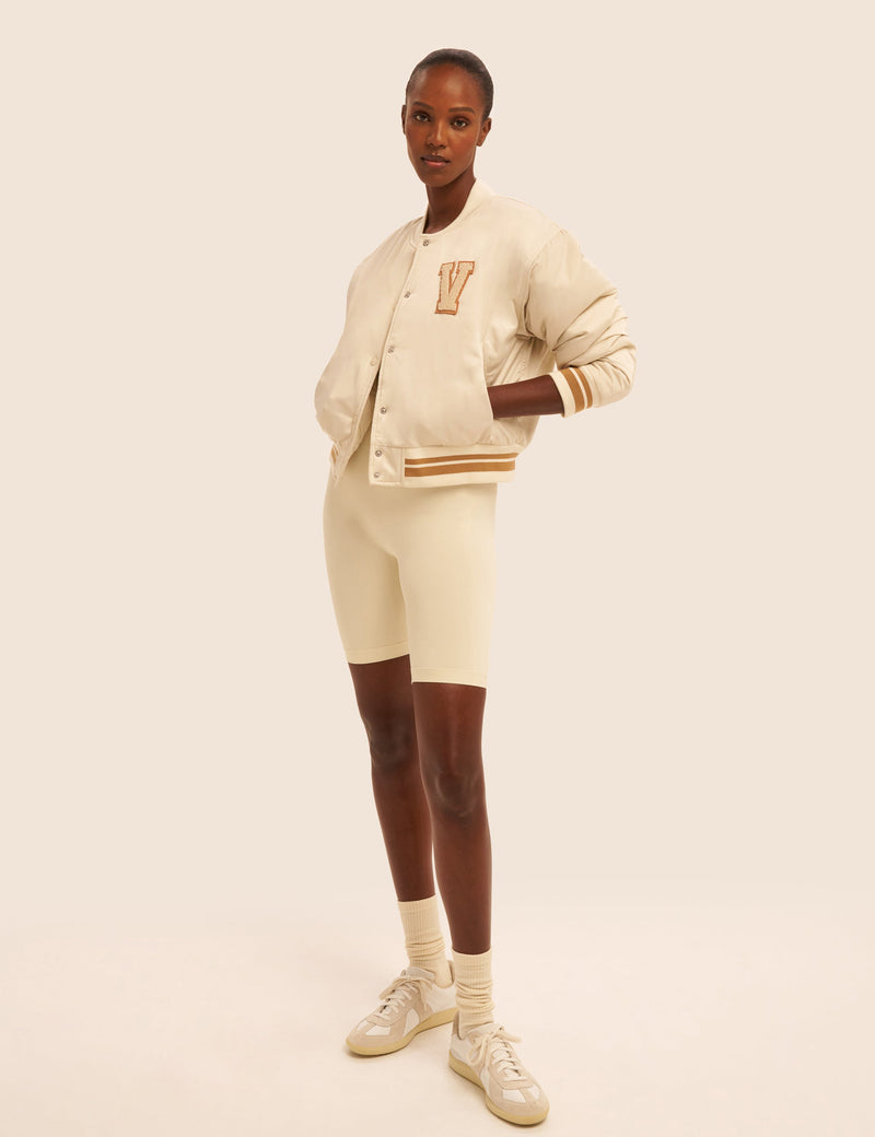 The VAARA Varsity Jacket is crafted from water-repellent fabric, providing practical protection against the elements. Lined with natural wadding for added warmth, the cropped silhouette offers a comfortable fit. Featuring varsity-inspired VAARA branding on the back and finished with knitted wool rib trims.