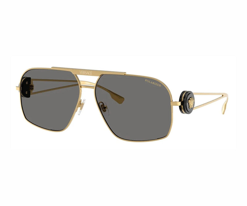 Step into timeless style with the VERSACE 2269 1002/81 sunglasses. Featuring a bold navigator shape, these sunglasses are crafted from sleek gold-tone metal for a luxurious and durable finish. The solid dark grey polarized lenses not only elevate your look but also provide superior glare reduction and UV protection, perfect for sunny days. Designed with classic Versace sophistication, the 2269 model effortlessly blends elegance with functionality. Ideal for those who value both high-end fashion and performance, these sunglasses are the ultimate accessory for making a strong, stylish statement wherever you go.