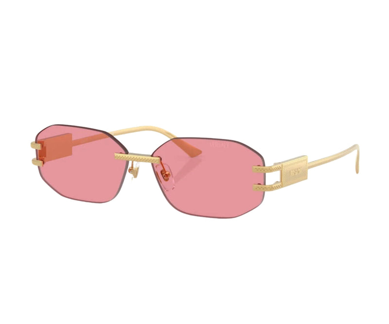 The VERSACE 2274 1002/84 sunglasses are a striking blend of elegance and luxury. Featuring a sleek gold metal frame, these sunglasses embody timeless sophistication and durability. The solid pink lenses add a vibrant, feminine touch, perfectly balancing the classic design with a modern edge. Offering UV protection, they ensure your eyes are shielded from harmful rays while maintaining clarity and style. Designed with comfort and refinement in mind, the lightweight metal construction provides a secure and comfortable fit for extended wear. Subtle VERSACE branding enhances the overall allure, making these sunglasses a standout accessory for any occasion. Perfect for those who desire a bold yet elegant statement piece that complements their wardrobe effortlessly.