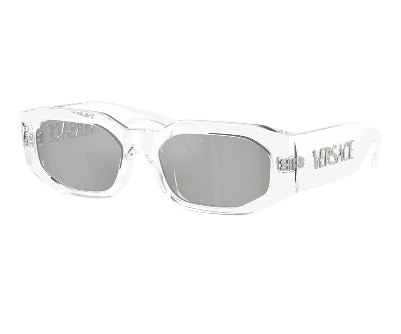 VERSACE 4489U 148/8V sunglasses offer a striking blend of modern design and classic luxury. Featuring an eye-catching irregular shape, the crystal acetate frame creates a bold yet refined look. The silver mirror lenses add a futuristic edge while providing essential UV protection for outdoor wear. Designed in a classic style with contemporary flair, this pair reflects VERSACE’s confident fashion identity and attention to detail. Lightweight and comfortable, these sunglasses are perfect for making a statement while elevating both casual and stylish outfits with a distinctive, high-fashion appeal.