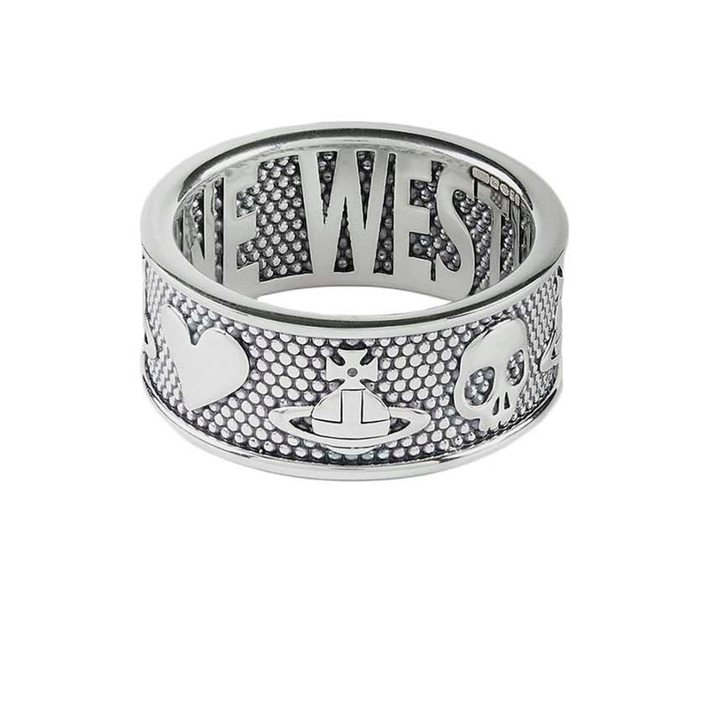 Elevate your accessory collection with the Vivienne Westwood Kingston Ring. Cut from sterling silver, this ring is designed with a thick brand engraved the brand's signature symbols and motifs. Adorned with oxidised beads throughout, this statement ring is finished with the Vivienne Westwood branding etched onto the inside of the piece for a luxury touch. Accompanied by branded packaging.