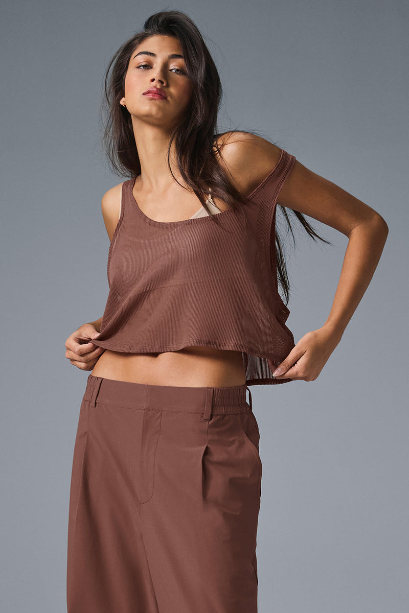 Made from a stretchy, sheer fabric with subtle tonal microstripes, this top is a whole mood. It has a classic tank silhouette with a wide scoop neck, a waist-grazing hem, and a boxy, flowy fit. Plus, it’s prime for vacation—lightweight, packable, and perfect for going from brunch to beach to sunset boat ride. Make it a set with the matching Tropical Nights Pants.