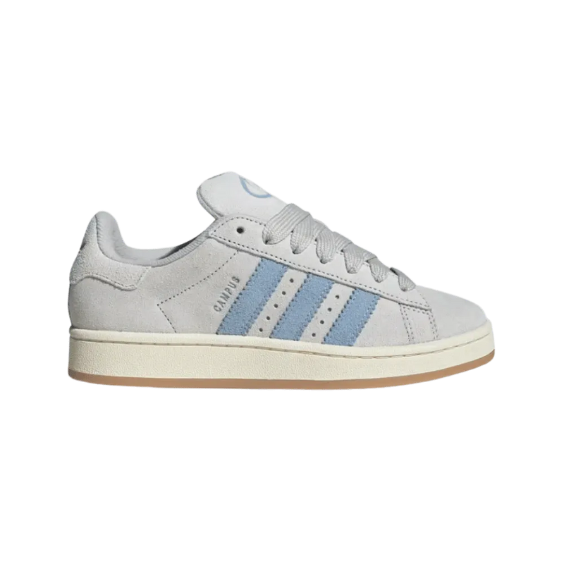 The Adidas Women's Campus 00s 'Grey Clear Sky' (model JH5627) is a contemporary reinterpretation of the classic 1980s Campus silhouette, infused with early 2000s skateboarding influences. This sneaker features a grey suede upper that combines smooth and hairy textures, offering a layered and textured finish. The iconic three stripes are presented in a 'Clear Sky' blue hue, adding a subtle pop of color to the design. A durable rubber outsole ensures reliable traction, while the padded collar and cushioned textile lining provide enhanced comfort for all-day wear. This versatile colorway allows for easy pairing with various casual outfits, making it a stylish addition to any wardrobe. ​