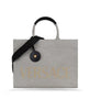 Elevate your style with this luxurious women's shoulder bag by Versace. Crafted from fabric with leather details, this tote bag features a spacious interior, zip closure envelope pocket, and fabric handles with leather accents. Adorned with a gold-colored rhinestone brand logo and a removable leather detail with a 3D brand logo. The shoulder strap, with leather finishes, showcases the brand's iconic Greek motif and is adjustable and detachable. Made in Italy. Dimensions: W38cm x H29.5cm x D12.5cm.